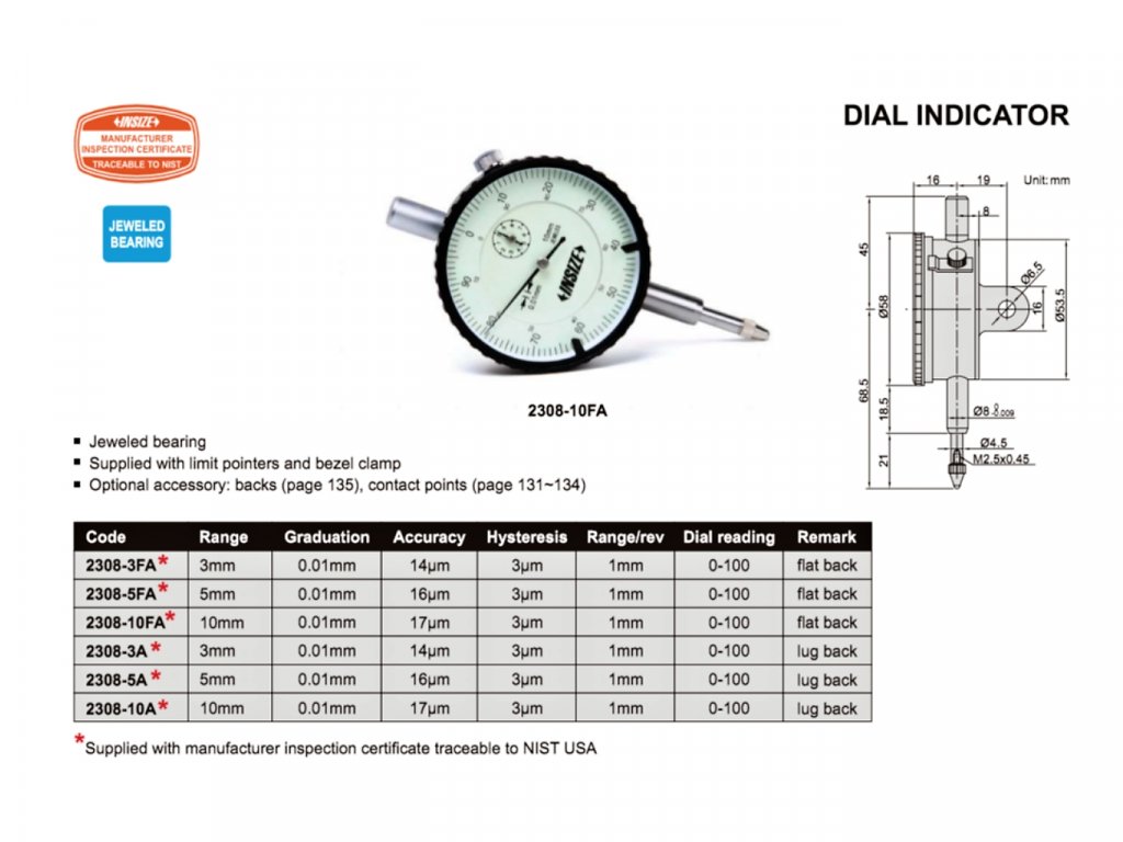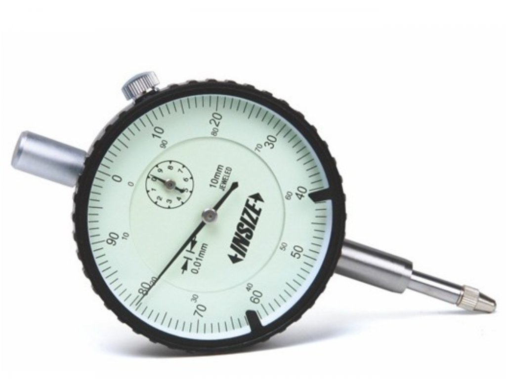 Az Insize standard analóg mérőóra lapos hátú, 0-10 mm tartományú, 0.01 mm osztással, nemeskőcsapággyal, értékhatár mutatókkal és óraüveg keret rögzítővel rendelkezik.