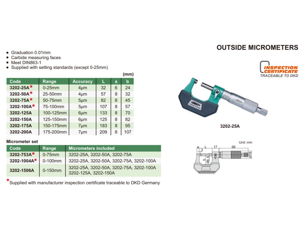 Az Insize standard analóg külső mikrométer 100-125 mm tartományú, 0.01 mm osztású és keményfémes mérőfelülettel rendelkezik.