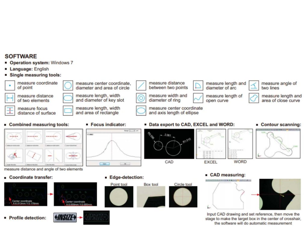 • Opcionális tartozékok: 0.5x kiegészítő tárgylencse (működési távolság: 175 mm, nagyítás: 16.5~97.5x), 2x kiegészítő tárgylencse (működési távolság: 36 mm, nagyítás: 66~390x), tapintó (⌀2 mm, ⌀3 mm-es hegyek és ⌀25 mm kalibráló golyó), lencse koaxiális megvilágítással (gyárban kell beszerelni)