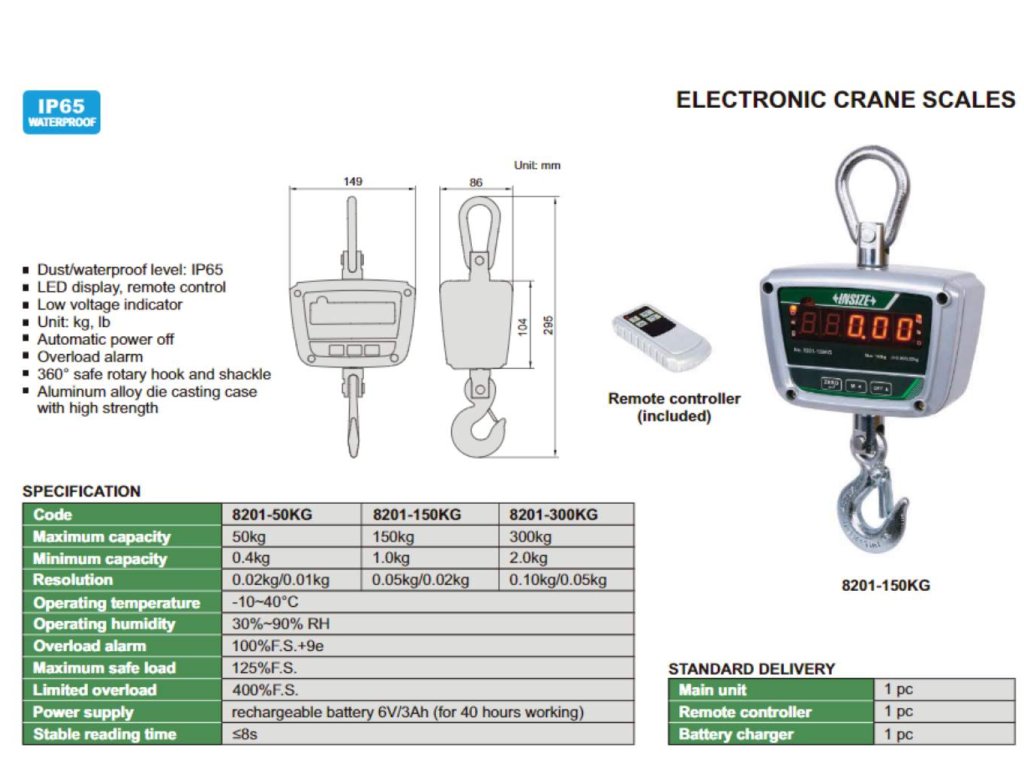 Az Insize darumérleg, IP65 víz és porálló, nagy szilárdságú alumínium ötvözetű öntvényből készült, 360° -on forgó horoggal, távirányítással és túlterhelési riasztóval rendelkezik.