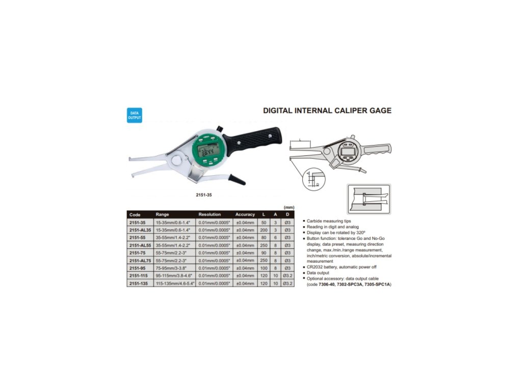 Az insize digitális belső tapintókaros mérőóra belső beszúrások, hornyok, átmérők mérésére alkalmas, 55-75 mm tartományú, 0.01 mm felbontással, 320° forgatható digitális és számjegyes olvasható kijelzővel rendelkezik.