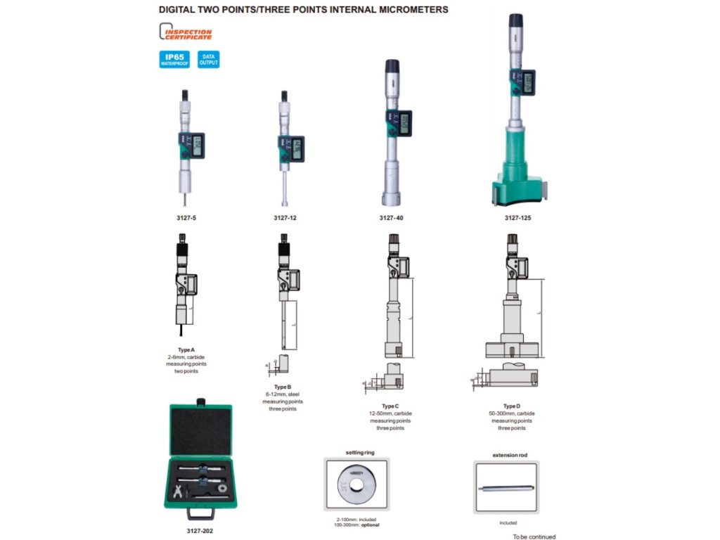 Az Insize digitális hárompontos furat mikrométer 25-30 mm tartományú, IP65 por és vízálló, 0.001 mm felbontású, keményfém mérőcsúcsokkal és racsnis stoppal rendelkezik.