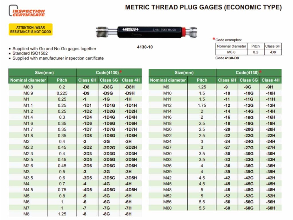 Az Insize "OK/NOK" kétoldalú dugós menetidomszer a metrikus ISO menetek megy/nem megy tűrés ellenőrzéséhez alkalmas.