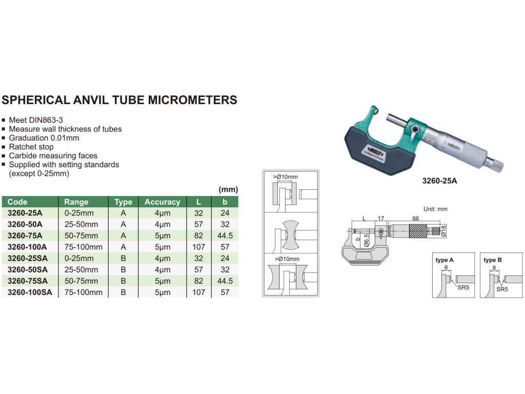 Az Insize analóg csőmérő mikrométer a csővastagság, csapágyak, gyűrűk méréséhez alkalmas. 50-75 mm tartományú, 0.01 mm osztású, racsnis stoppal és keményfémes gömb ülékkel és lapos mérőorsóval rendelkezik.