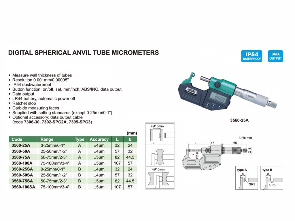 Az Insize IP65 vízálló digitális csőmérő mikrométer a csővastagság, csapágyak, gyűrűk méréséhez alkalmas. 75-100 mm tartományú, 0.001 mm felbontással, racsnis stoppal és keményfémes gömb alakú mérőfelületekkel rendelkezik.
