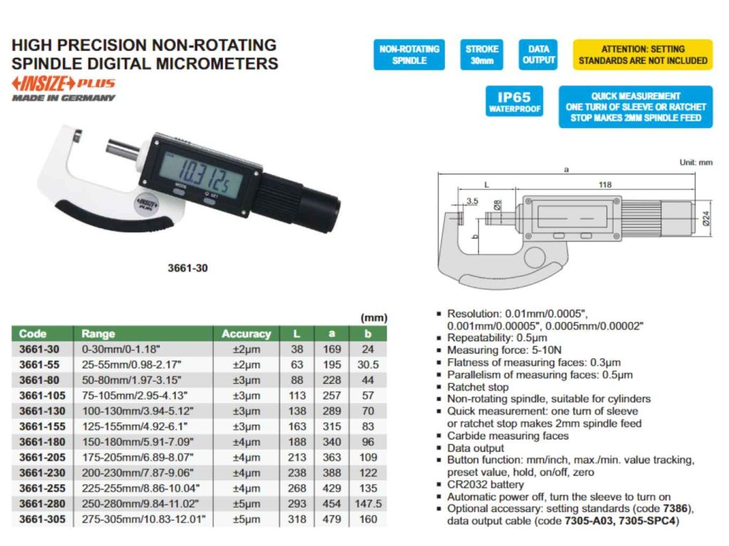 Az Insize precíziós digitális nem-forgó orsós külső mikrométer IP65 vízálló, 0-30 mm-es tartományú, racsnis stoppal és keményfémes mérőfelületekkel, a hengerek méréséhez alkalmas.